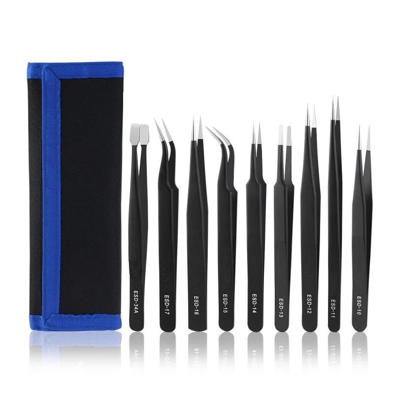 This set offers ESD protection, which sets it apart from conventional tweezers by preventing damage from static discharge. In addition, the stainless steel construction ensures corrosion resistance and greater durability against wear, unlike those made from carbon steel or lower-quality materials, which can lose precision and rust more quickly.