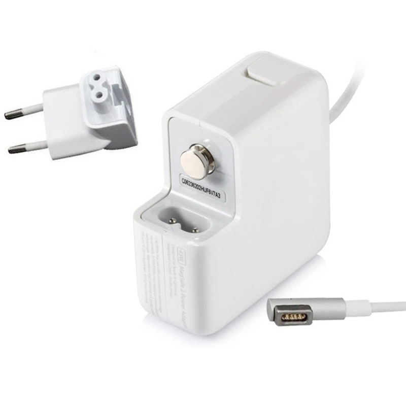 El cargador 45W Magsafe compatible para MacBook Air es un adaptador de energía diseñado específicamente para este modelo de portátil Apple. Cuenta con un conector DC magnético que garantiza una desconexión segura en caso de tirones accidentales, lo que ayuda a prevenir cortocircuitos y el desgaste prematuro del cable.